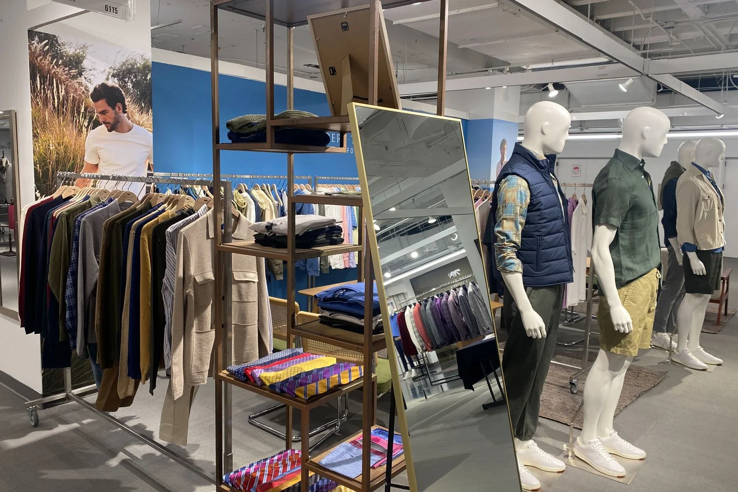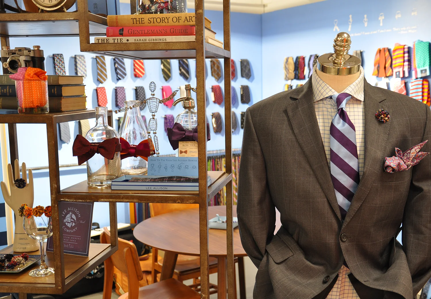 A narrow cube-shelving unit with a thin, weathered bronze frame and hickory wood veneer shelves. Display your products on a piece of art and capture your customers imagination.