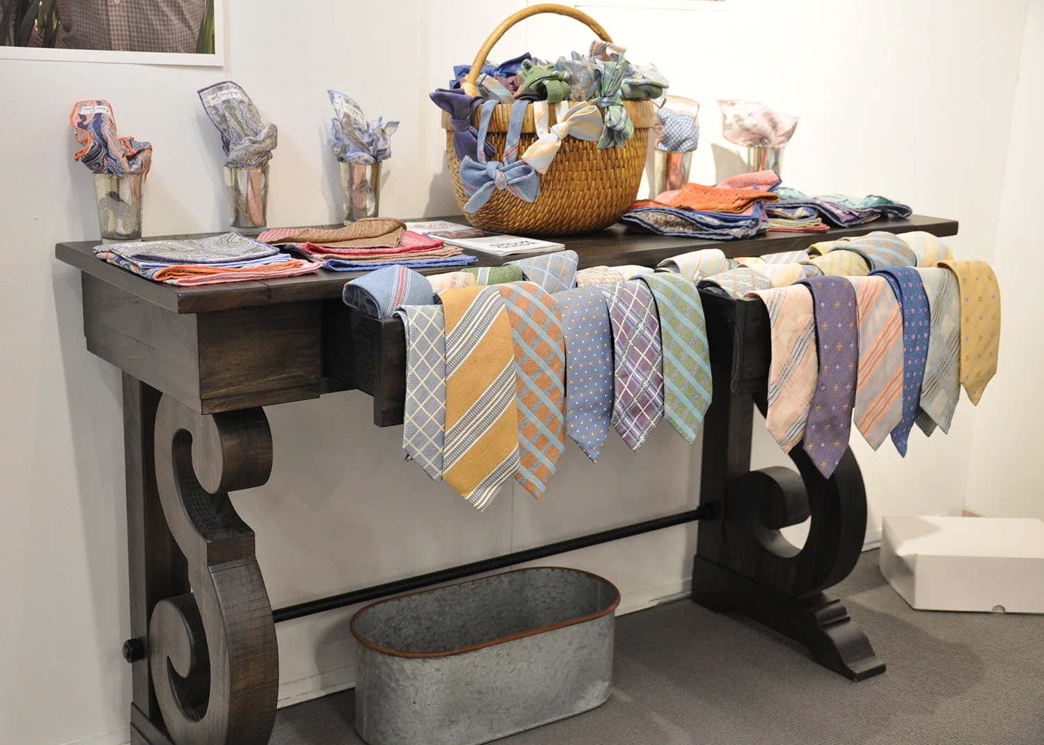 Console table in a weathered gray with drawers and a beefy scrolled base. A bold, functional table to highlight product