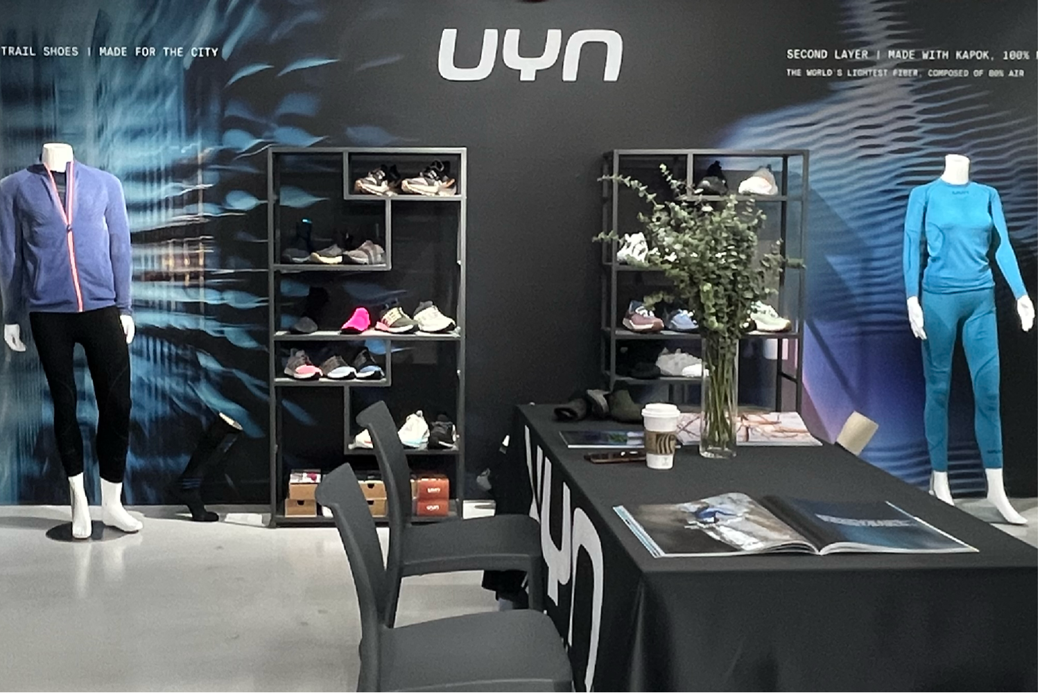 A shelving unit with gray powder-coated frame and granite shelves ideal for merchandising shoes and accessories.